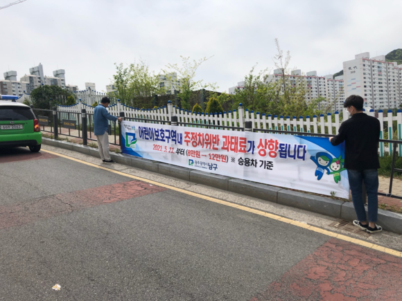 남구는 어린이 보호구역 내 주정차 위반 과태료가 큰 폭으로 인상되면서 과태료 부과에 대한 반감이 클 것으로 보고, 도로교통법 시행령 개정안이 효력을 발휘하기 전까지 관내 곳곳에 현수막을 내걸고 주민들을 대상으로 적극적인 안내 및 홍보활동을 전개하고 있다.