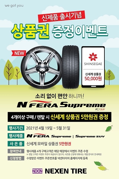 먼저 고객 사은 이벤트는 19일부터 5월 31일까지 진행되며, '엔페라 슈프림' 4개를 구매 및 렌탈 하는 고객에게 신세계 백화점 상품권 5만원권을 증정한다. 이벤트 참여 매장에서 행사 제품을 구매한 후 수령한 이벤트 쿠폰의 번호를 넥센타이어 홈페이지 내 이벤트 페이지에 등록하면 휴대폰 번호로 모바일 쿠폰이 2주 이내로 발송된다.