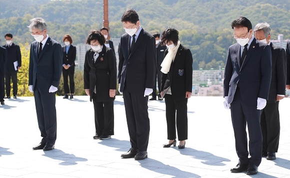 김경수 경남도지사가 제61주년 4·19혁명 기념일인 19일 오전 3·15민주묘지를 찾아 참배하고 있다. (사진=경남도 제공)