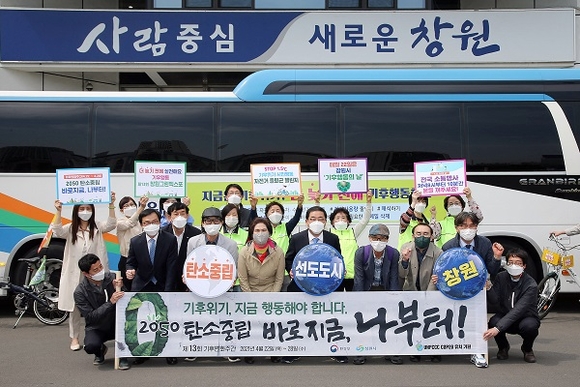 첫 시작으로, 시는 이날 오후 2시 시청 본관 앞에서 경남기후위기비상행동, 창원시 지속가능발전협의회, 창원시 그린리더, 창원시 자전거 챌린지 홍보단 등 기후환경 활동가 20명과 함께 '2050 탄소중립 바로 지금, 나부터! 실천 선언식'을 개최했다.