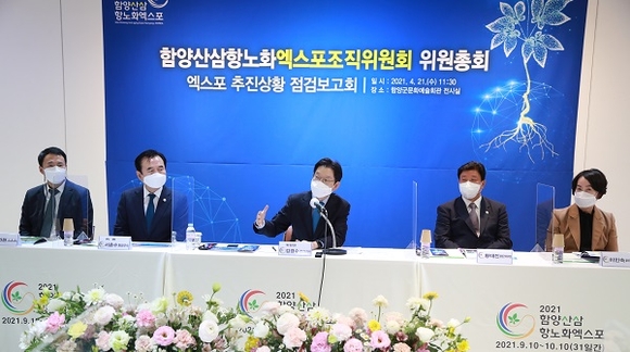 조직위원장인 김 지사는 21일 오전 엑스포 제1행사장인 상림공원 내 함양군문화예술회관에서 진행된 '2021 함양산삼항노화엑스포 추진상황 점검보고회'를 주재하고 “함양산삼의 우수성, 효능, 특성이 제대로 알려지고 향후 국내 바이오산업의 중요한 물질이 되도록 만들어가야 한다”며 이같이 말했다.