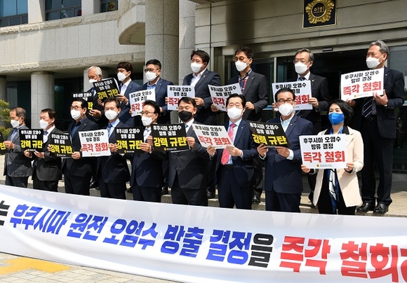 경남도 수협장협의회 소속 10개 지역 도내 수협장과 수협중앙회 경남본부장은 21일 경남도의회 광장에서 후쿠시마 원전 방사능 오염수 방류을 결정한 일본 정부를 규탄했다.