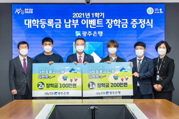 광주은행(은행장 송종욱)은 지난 2월 8일부터 3월 31일까지 실시한 ‘2021년 1학기 대학등록금 납부 이벤트’의 당첨자를 발표하고, 등록금 납부 이벤트의 1등과 2등 당첨고객 2명을 본점에 초청하여 장학금 증정식을 가졌다고 밝혔다.