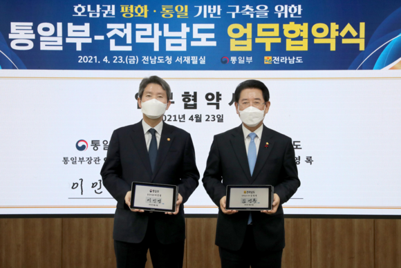 전라남도는 23일 도청에서 통일부와 호남권 통일+센터 설치·운영에 따른 협력체계 플랫폼 구축 업무협약을 했다.
