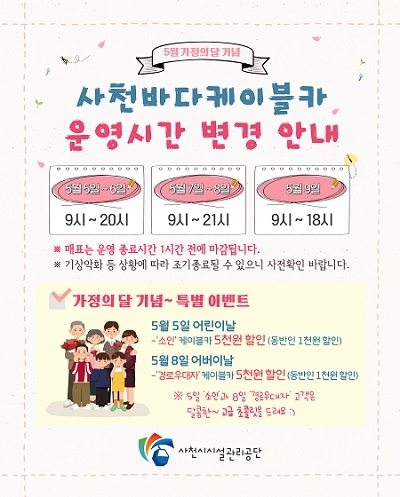 공단 박태정 이사장은 “우리 케이블카는 한국관광공사 경남지사 안심나들이 명소 10선에 선정될 정도로 방문객들이 안전하게 여행할 수 있도록 방역활동에 철저를 기하고 있다”며 “가정의 달을 맞아 아름다운 자연과 여유를 즐길 수 있는 사천바다케이블카에 오셔서 가족과 함께 행복하고 즐거운 추억 많이 만들어 가시기 바란다”고 강조했다.