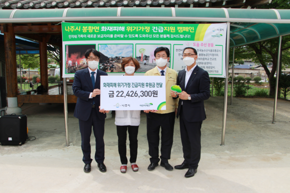 전라남도 나주시(시장 강인규)와 초록우산어린이재단 전남지역본부(본부장 박수봉)가 2달 전 화재 피해를 입은 봉황면 조손가구에 지난 28일 후원금 2240만원을 전달했다.