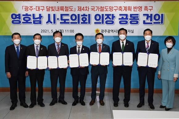 경남도의회 김하용 의장을 비롯한 영호남 시·도의회 의장들이 3일 오전 광주시의회에서 달빛내륙철도 건설사업의 제4차 국가철도망 구축계획 반영을 위한 공동 건의문을 발표했다.