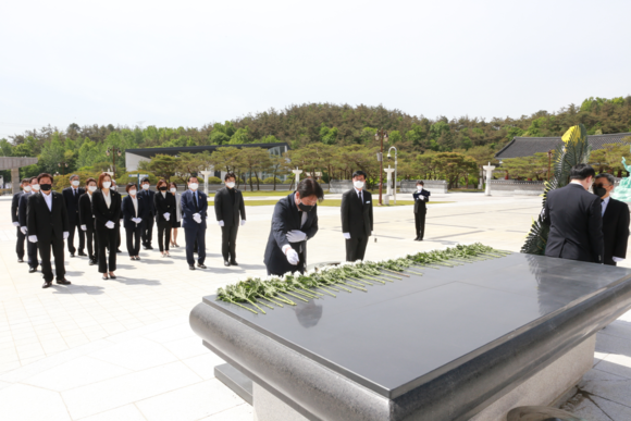 민주묘지 관계자 안내로 박희율 의장의 방명록 서명과 추모탑으로 이동 헌화 및 분향 그리고 희생자가 안장된 묘역을 둘러보는 순으로 진행했다.