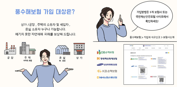 풍수해보험은 주택, 농·임업용 온실(비닐하우스 포함), 소상공인이 운영하는 상가와 공장을 대상으로 태풍, 호우, 홍수, 강풍, 풍랑, 해일, 대설, 지진의 8개 유형의 자연재난으로 피해 발생 시 보상해 주는 정책보험이다.