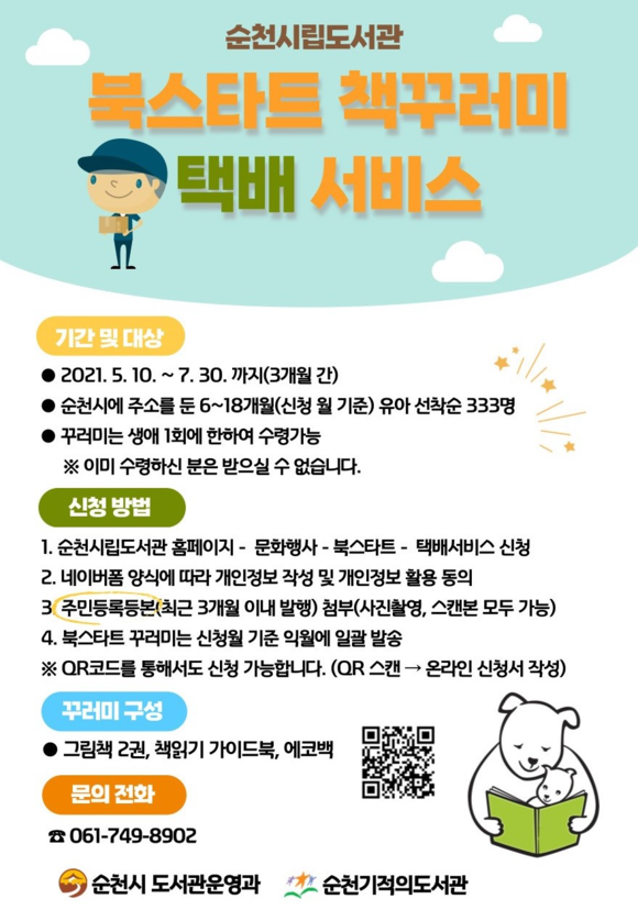 한편, 순천시는 지난해 코로나19로 도서관을 방문하기 어려운 이용자의 불편을 해소하기 위하여 꾸러미 수령 대상자 중 기한이 임박한 16~18개월 유아를 대상으로 택배서비스를 운영한바 있다.