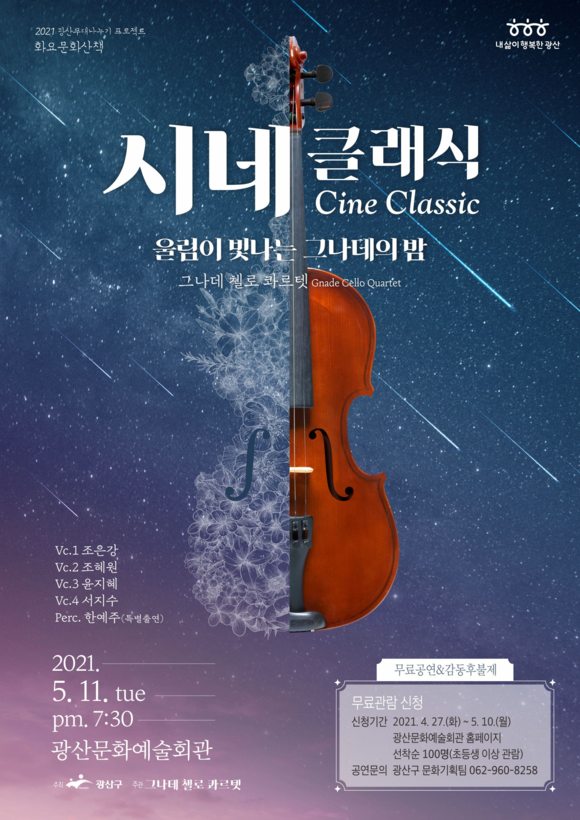 광주 광산구(구청장 김삼호)가 11일 오후 7시30분 광산문화예술회관에서 첼로 4중주팀 그나데 첼로 콰르텟의 클래식 공연 ‘시네 클래식’을 개최한다.