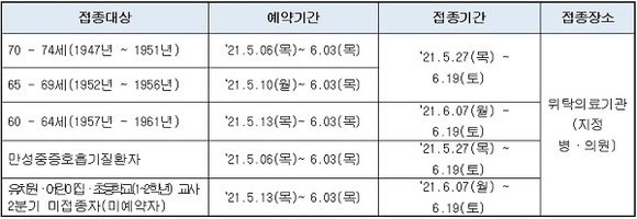 대상자별 사전예약과 접종기간은 다음 표와 같으며, 6월 21일 이후에는 위탁의료기관 방문 시 현장에서도 접수가 가능하다.