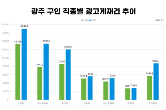 광주·전남 취업포털 사랑방구인구직(job.sarangbang.com)이 광주지역 구인광고 현황을 분석한 결과, 올해 1월부터 4월까지 구인광고 게재건수는 23만1184건으로 전년 동기(18만5557건) 대비 약 24.6% 증가했다. 코로나19 확산 전인 2019년 같은 기간(22만9548건)과 비교해봤을 때도 약 0.7% 늘어난 수치다.