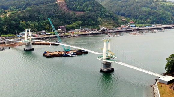 광양시가 지난 7일, ‘망덕포구 및 백두대간 종점 관광명소화사업’의 마지막 단계인 ‘배알도~망덕포구’ 해상보도교 상부가 성공적으로 가설됐다고 밝혔다.