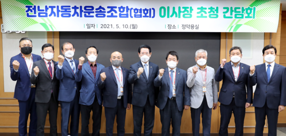 전라남도는 10일 운송업계 현장 목소리를 듣고 코로나19 재난지원금 및 교통정책 등에 반영하기 위해 자동차운송업계조합(협회) 이사장들과 도시락 간담회를 했다.