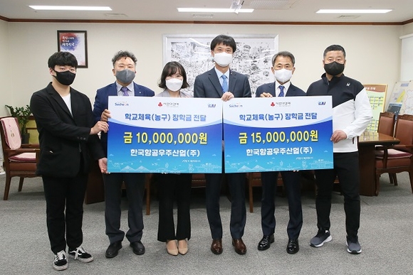 한국항공우주산업(KAI)이 10일 경남 사천시에 학교체육과 여자농구 발전을 위해 써 달라며 2500만원의 장학금을 기탁했다.