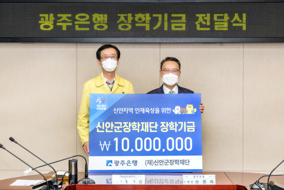광주은행(은행장 송종욱)은 신안군청에서 송종욱 광주은행장과 박우량 신안군수, 김혁성 신안군의회 의장 및 관계자 등이 참석한 가운데 (재)신안군장학재단 장학기금 전달식을 가졌다고 밝혔다.