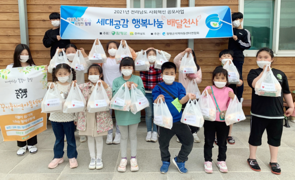 함평군에 따르면 ‘세대공감, 행복나눔 배달천사’ 사업은 관내 지역아동센터 이용 아동들이 천연비누, 눈꽃빵 등 직접 만든 제품과 손 편지를 지역 어르신들께 전달하는 사업이다.