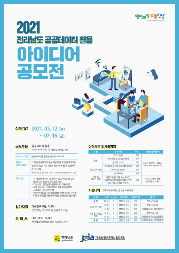 전라남도는 전남정보문화산업진흥원과 함께 공공데이터 활성화 및 혁신창업 촉진을 위해 ‘2021년 전라남도 공공데이터 활용 아이디어 공모전’을 개최한다.