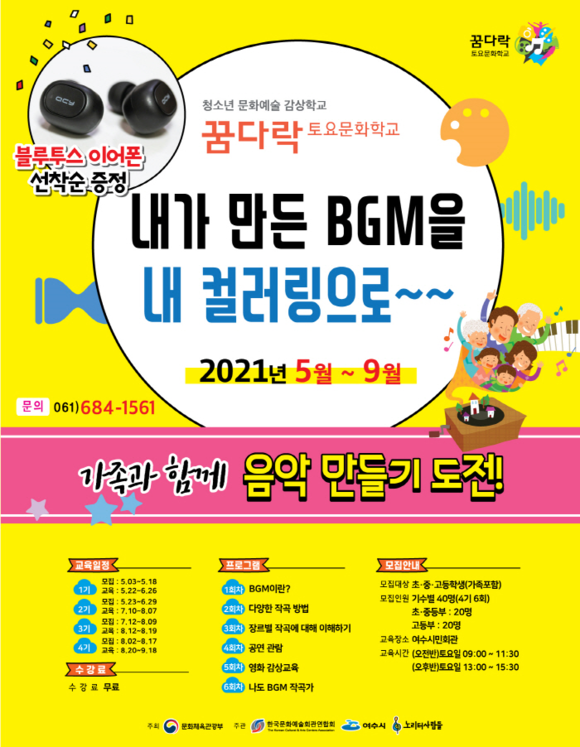 꿈다락 토요문화학교는 ‘내가 만든 BGM을 내 컬러링으로’라는 주제로 오는 22일부터 9월 18일까지 4기로 나눠 매주 토요일 여수시민회관에서 무료로 교육한다.