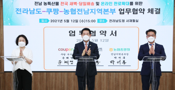 전라남도는 12일 도청 정약용실에서 김영록 도지사, 윤혜영 쿠팡 리테일 부사장, 박서홍 농협중앙회전남지역본부장 등이 참석한 가운데 쿠팡, 농협중앙회전남지역본부와 전남 농축수산물 소비 촉진 및 온라인 판로 확대 업무협약을 했다.