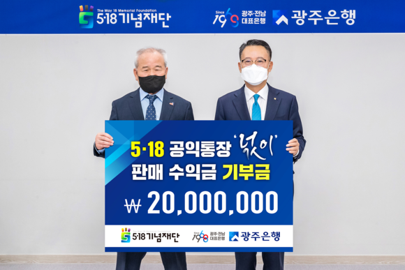 광주은행(은행장 송종욱)은 13일, 5·18기념재단에서 송종욱 광주은행장과 정동년 5·18기념재단 이사장 등이 참석한 가운데 ‘「넋이」5월, 그 날을 기억하며(이하 ‘넋이통장’)’의 수익금을 기부하는 전달식을 가졌다고 밝혔다.