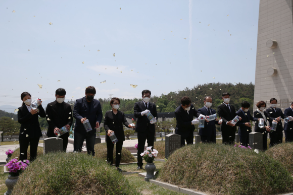 참석자들은 오월 영령들의 명복을 빌며 함평군이 직접 키운 518마리 배추흰나비를 국립 5·18 민주묘지 상공으로 날려 보냈다.