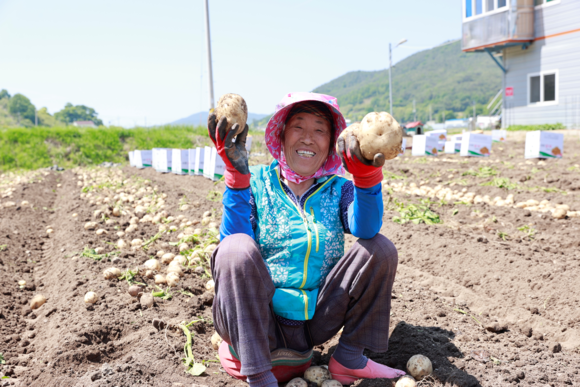 13일 보성군 회천면 회령리 일원에서 봄 감자 출하 작업을 하고 있는 농업인이 수확한 감자를 들고 활짝 웃고 있다. 보성군은 지난 7일부터 노지 봄 감자 수확이 시작되었으며, 5월에는 추백 품종이 6월부터는 수미감자가 본격적으로 출하될 예정이다.