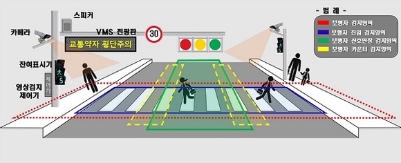 '보행신호 자동연장시스템'은 횡단보도에서 보행자를 검지하는 기술을 적용하여 주어진 보행신호시간 동안 횡단을 완료하지 못한 보행자를 위해 허용된 시간범위(5~10초)에서 교통신호제어기와 통신을 통해 '보행신호시간을 자동으로 연장'하여 어린이, 노약자, 장애인 등 '교통약자의 안전횡단'을 지원해 주는 시스템이다.