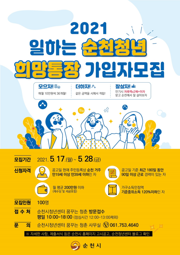 순천시(시장 허석)는 청년들의 안정적인 미래 준비와 자립기반을 지원하기 위해 ‘일하는 순천청년희망통장’신규 가입자를 오는 28일까지 모집한다.