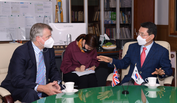 17일 여수시에 따르면 사이먼 스미스 주한 영국대사 일행이 14일 오후 삼산면 거문도 영국군 묘지를 참배한 후, 15일 오전 여수시를 찾아 권오봉 여수시장과 영국의 COP26 개최 상황을 공유하고, 여수시의 COP28 유치 지지 협력과 기후변화대응 방안 등을 논의했다.
