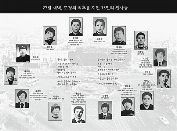 도청을 마지막까지 사수하다 산화한 시민군 15인의 이름은, 문재학, 안종필, 박성용, 김종연, 서호빈, 유동운, 박병규, 김동수, 민병대, 윤상원, 박진흥, 문용동, 이정연, 홍순권, 이강수이다.