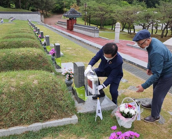 윤상원 일기를 책으로 엮어낸 황광우(인문연구원 동고송 상임이사)작가와 더불어민주당 이용빈 의원(광주 광산갑)은 17일 5.18 당시 시민군 대변인이었던 윤상원 열사의 일기와 그의 부친 윤석동 선생의 일기를 책으로 엮어 5.18 망월묘지에 있는 윤상원 열사의 묘지에 헌정했다.