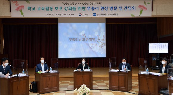 유은혜 부총리는 센터 방문에 앞서 대회의실에서 모여 광주서부교육지원청 박주정 교육장으로부터 센터의 역할과 기능 수행에 대한 설명을 간단히 들은 후 6명의 학교 현장 교원들을 초청해 간담회를 실시했다. 간담회에서는 교권침해 실제 사례 및 교육활동보호 정책 수립 관련 아이디어 등을 공유할 수 있었다. 유은혜 부총리는 학교 교원들의 진솔한 이야기를 빠뜨리지 않고 경청했다. 정리 발언에서는 교원들의 소중한 의견을 반영해 향후 교육활동 보호 정책 개선에 대한 굳은 의지를 보여줬다.