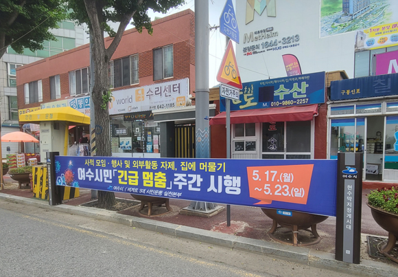 여수시 곳곳에 사적모임‧행사 및 외부활동 자제를 호소하는 ‘긴급 멈춤’주간 전 시민 참여 홍보 현수막이 걸렸다.