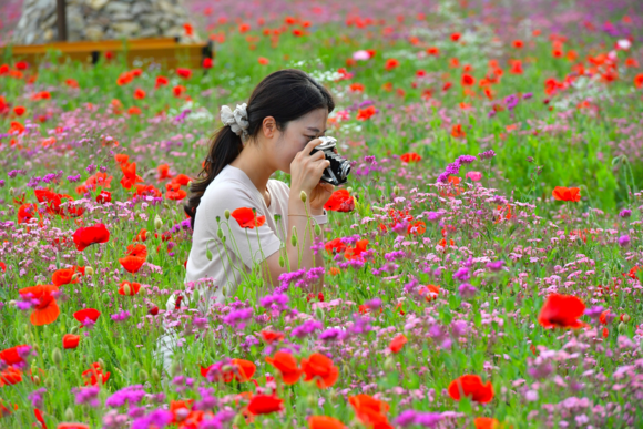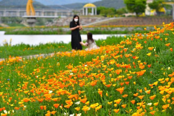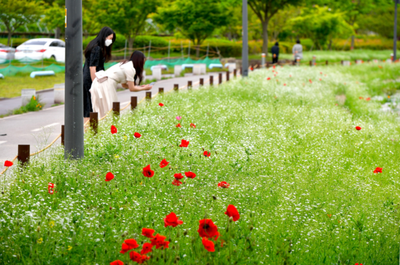 진한 빨강 꽃잎을 한껏 뽐내고 있는 꽃양귀비는 강변 곳곳에서 만날 수 있다. 안개초, 끈끈이대나물과 함께 황룡강 꽃길의 아름다움을 책임지고 있다.