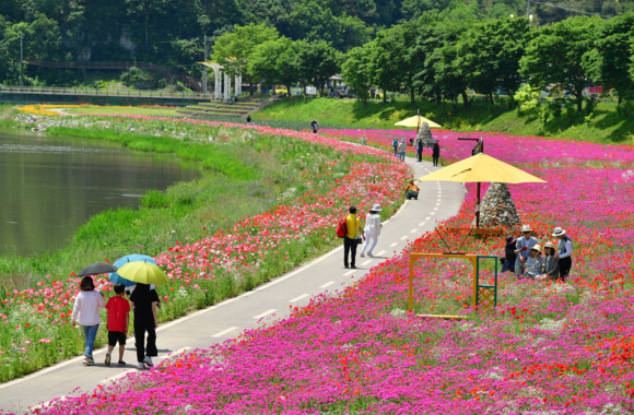 장성 황룡강에 피어난 화사한 봄꽃들이 찾는 이들의 눈길을 사로잡고 있다.