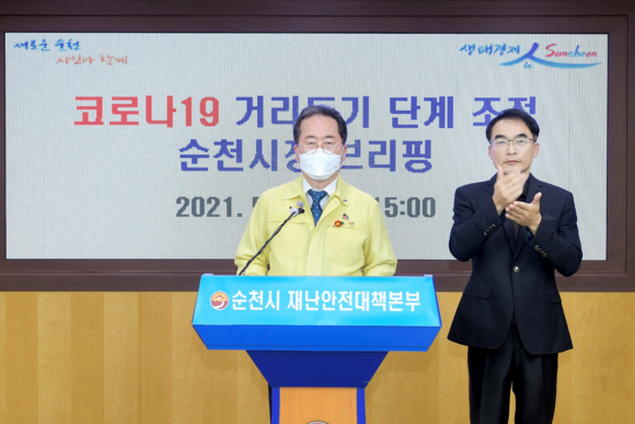 허석 순천시장은 23일 영상브리핑을 통해 “순천·여수·광양 3개 공동대응하기로 한 협의와 민관공동대책위원회의 의견수렴을 거쳐 전라남도의 개편된 사회적 거리두기 1단계로 완화한다.”고 발표했다.