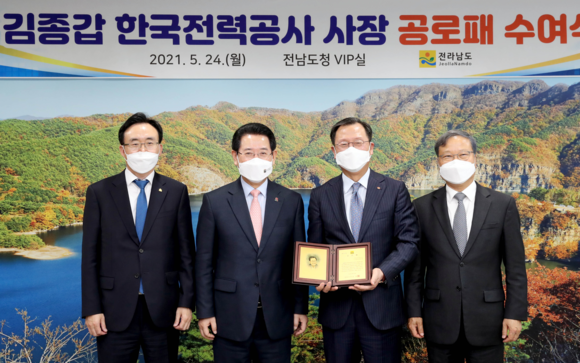 김영록 전라남도지사는 24일 도청에서 전남 에너지산업과 경제발전에 기여한 김종갑 한국전력공사 사장에게 공로패를 수여했다.