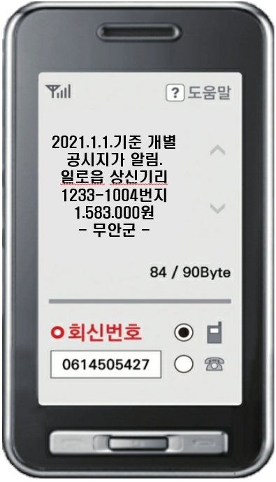 무안군(군수 김산)은 개별공시지가를 휴대전화 문자로 신속하게 알려주는 ‘개별공시지가 자동 문자알림 서비스’를 시행중이라고 밝혔다.