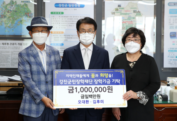 강진군민장학재단(이사장 이승옥)은 지난 24일 정우건설(주) 이동훈 대표가 200만 원, 오대환·김후미 부부가 장학금 100만 원을 기탁했다고 밝혔다.