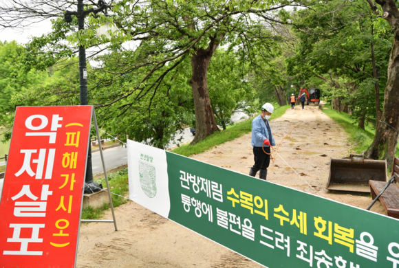 담양군이 천연기념물 제366호 담양 관방제림 내 푸조나무의 수세 회복을 위해 영양공급 작업을 진행하고 있다.