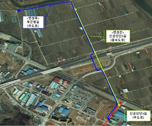 광양시는 옥곡면 신금리 신금산단에서 옥진평야를 가로지르는 기존 ‘신금산단3길’ 일부를 ‘옥진평길’로 도로명 및 도로구간을 지난 20일 변경 고시했다.