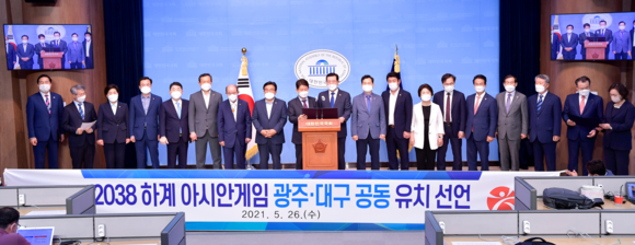 이용섭 광주광역시장과 권영진 대구광역시장은 26일 오후 국회 소통관에서 “양 시민들의 염원을 모아 ‘2038 하계 아시안게임 공동유치’를 위해 함께 노력하겠다”고 밝혔다.