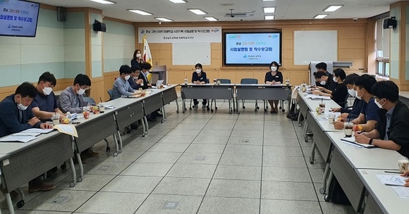 경남도교육청은 26일 교육연구정보원 세미나실에서 2021년 그린스마트 미래학교 대상학교 사전기획 추진을 위한 용역수행 업체를 선정하고 첫 '사업설명 및 착수보고회'를 개최했다.