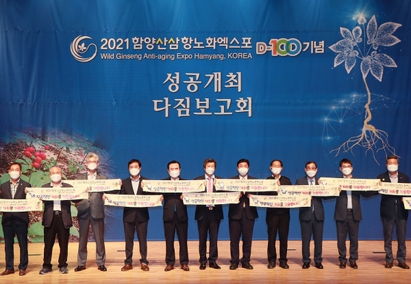 함양산삼항노화엑스포조직위는 27일 함양군 문화예술회관 대공연장에서 서춘수 함양군수를 비롯해 유관기관·단체장, 함양군민 등 200여명이 참석한 가운데 함양산삼항노화엑스포 성공개최 다짐을 위한 D-100일 기념 추진상황 보고회를 가졌다.