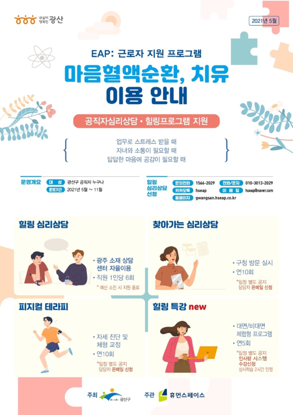 28일 광산구에 따르면 이번 프로그램은 근로자지원프로그램(EAP) 전문기관을 통해 △온라인 스트레스 자가진단 △힐링 심리상담 △찾아가는 심리상담 △피지컬 테라피 △힐링특강으로 구성해 진행한다. 직무 스트레스나 정서소진, 대인관계 문제를 겪거나 우울, 불안, 가족관계 갈등을 겪는 등 다양한 사례에 대한 상담이 가능하다.