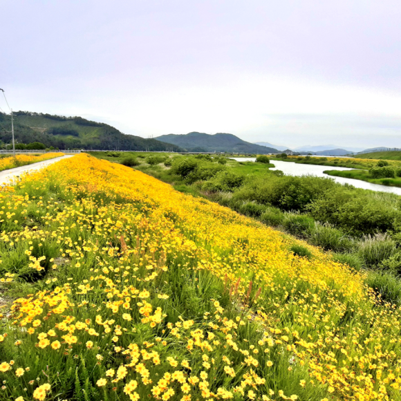 장흥군 부산면 용반리 탐진강 제방에는 지금 금계국들이 활짝 피어 온통 황금빛을 이루고 있다.