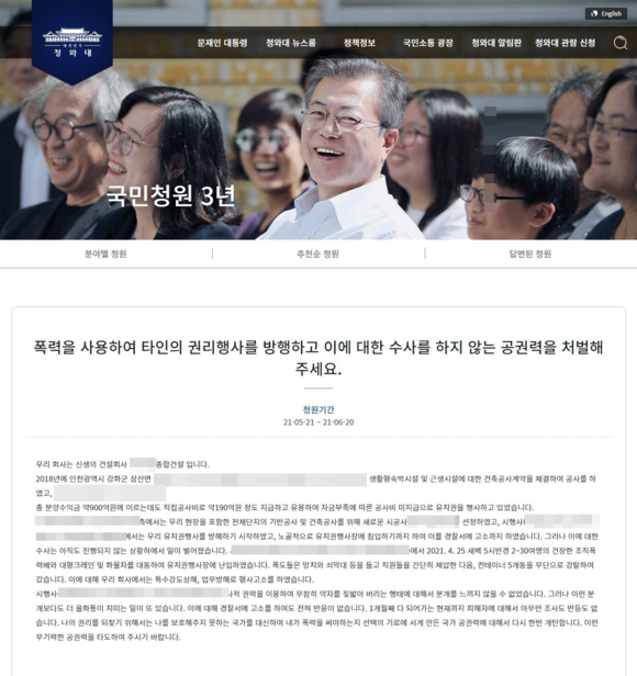 수십억 공사비를 받지 못해 유치권을 행사 중이던 광주지역 건설업체가 시행사 측에서 동원한 30여 명의 용역(청년)들이 난입해 사용 중인 컨테이너와 재산을 강탈해 갔다는 억울함을 호소하는 내용의 글이 청와대 국민청원이 게시됐다.
