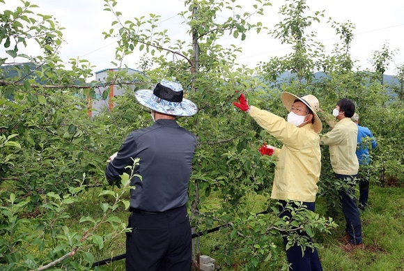 이날 일손돕기에는 박일호 시장도 함께 방문해 사과적과(열매솎기) 작업에 일손을 보태고, 최근 잦은 강우와 일조량 부족으로 낙과 피해를 입은 농가를 방문해 격려했다.